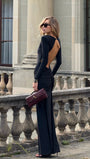 Draped evening dress with structured shoulders and open back balances restraint with sensuality. The clean silhouette is sculpted through precise draping and subtle shoulder structure, creating a defined, architectural shape.