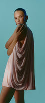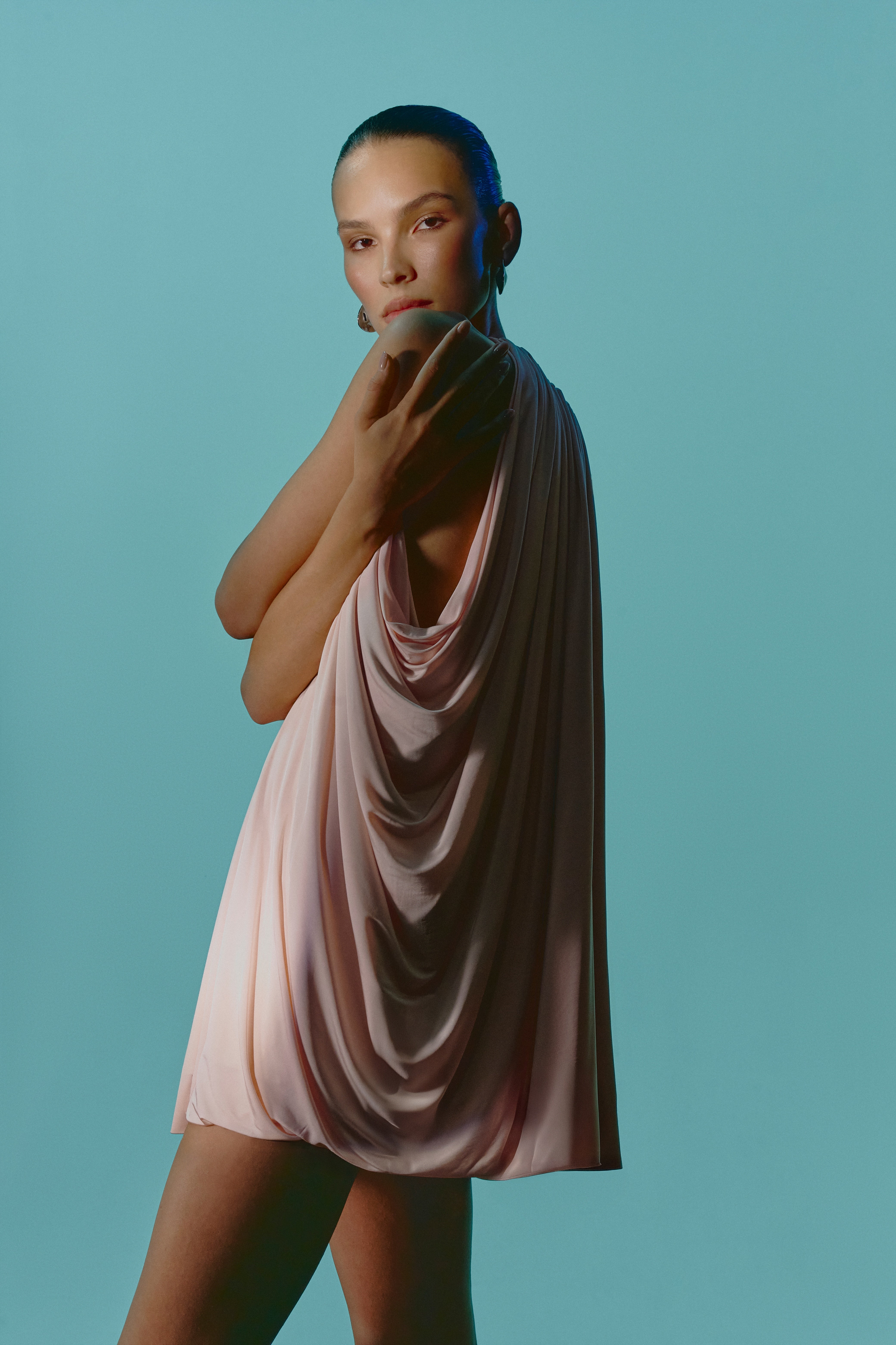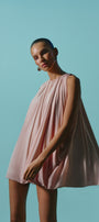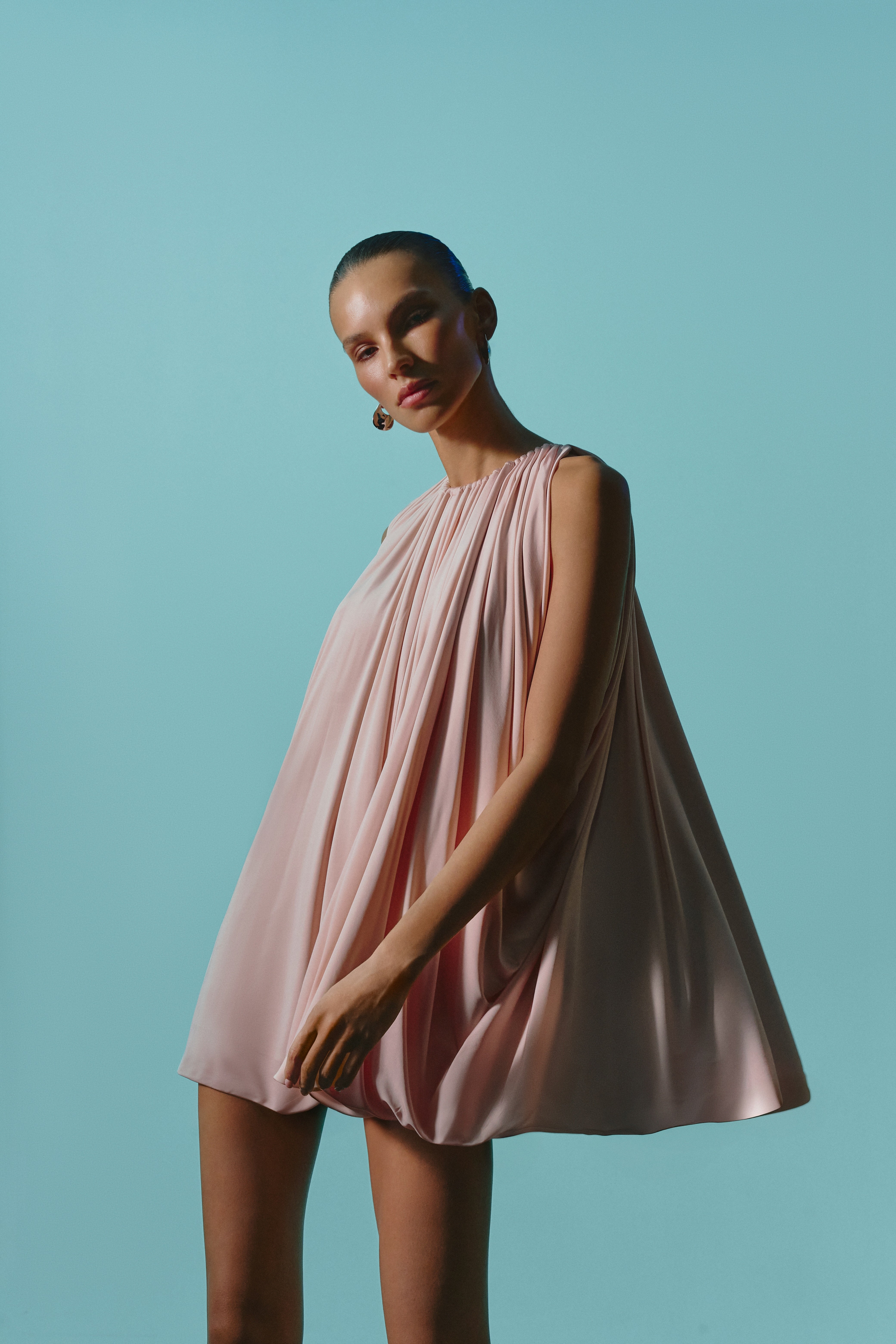 Пастельно-рожева міні сукня балон на тонких бретелях створює легкий і грайливий силует. Ніжний відтінок огортає фігуру м’яким сяйвом, а форма балон додає об’єму та сучасної виразності.
