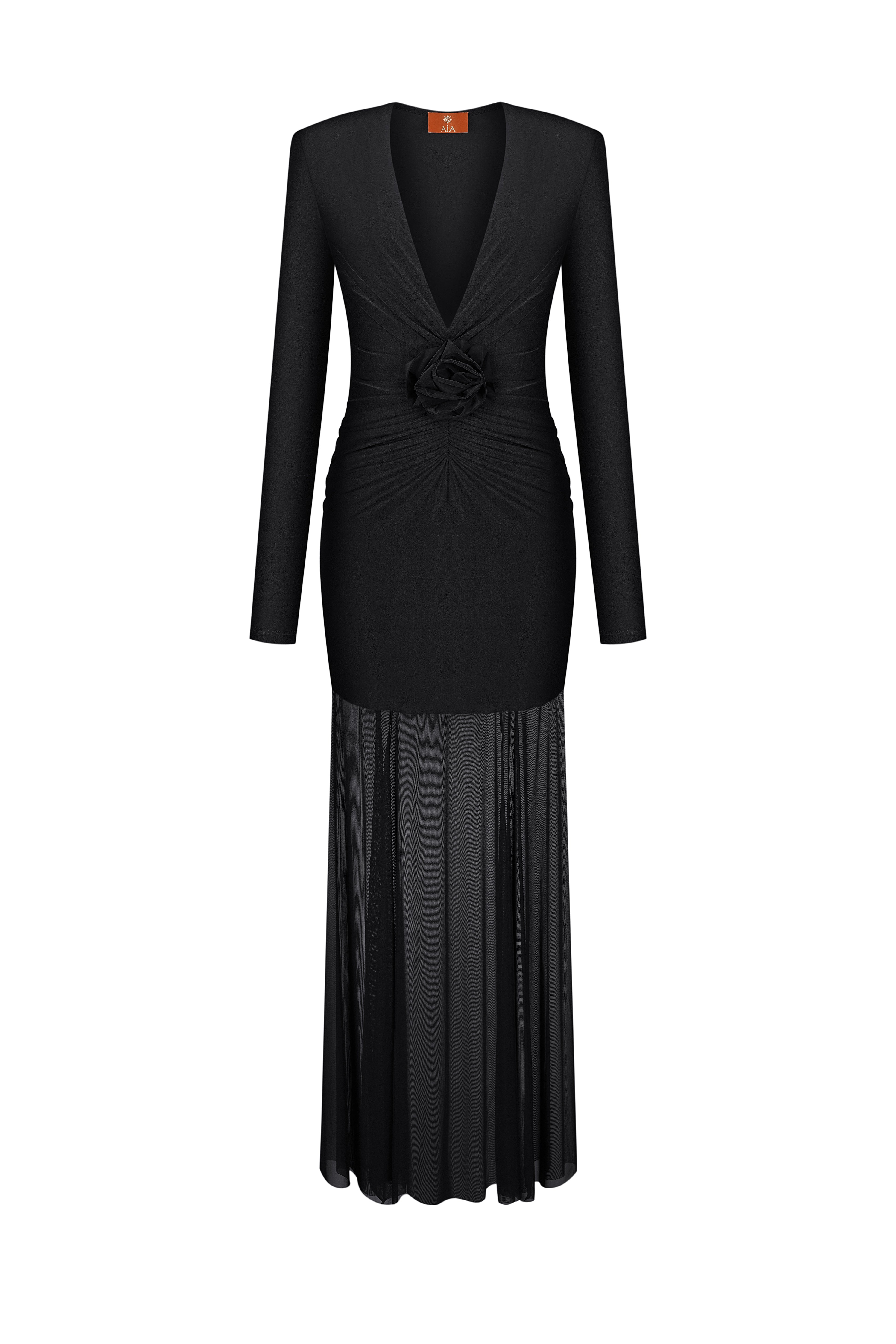 Акцент на талії у вигляді об’ємної квітки підкреслює витончену лінію фігури.