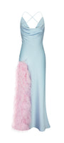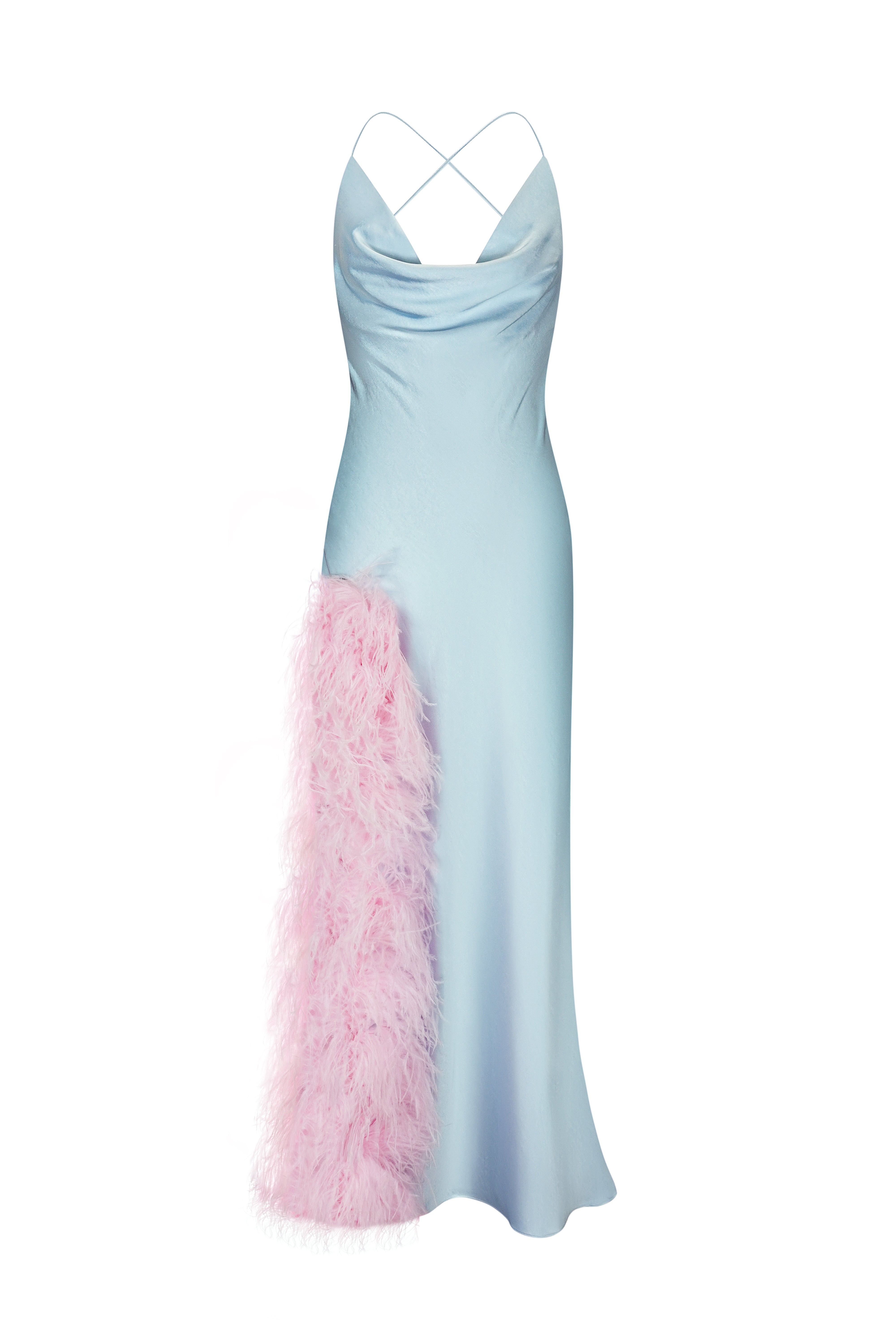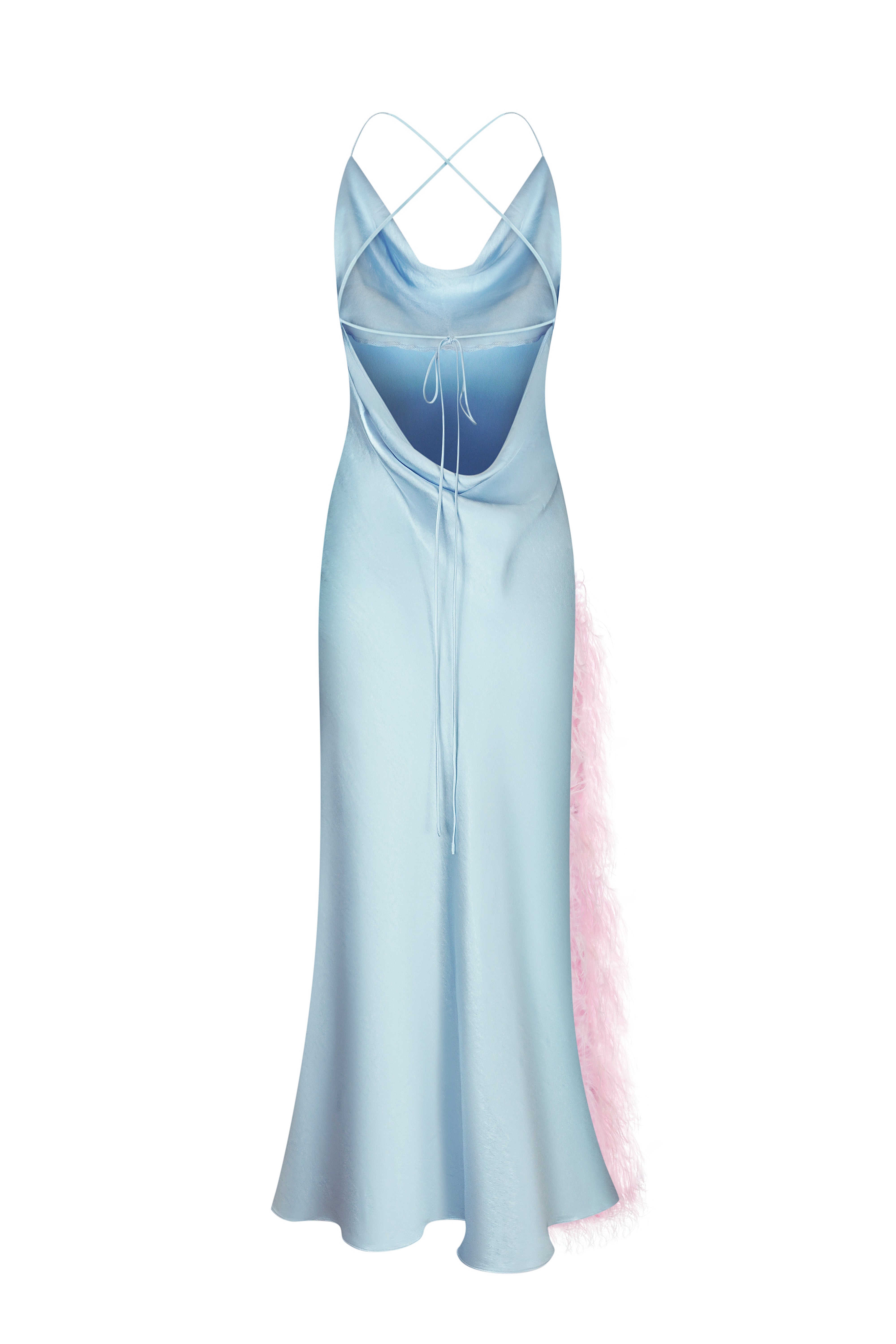 Густе пір’я рухається разом із силуетом, додаючи образу драматичної легкості.
