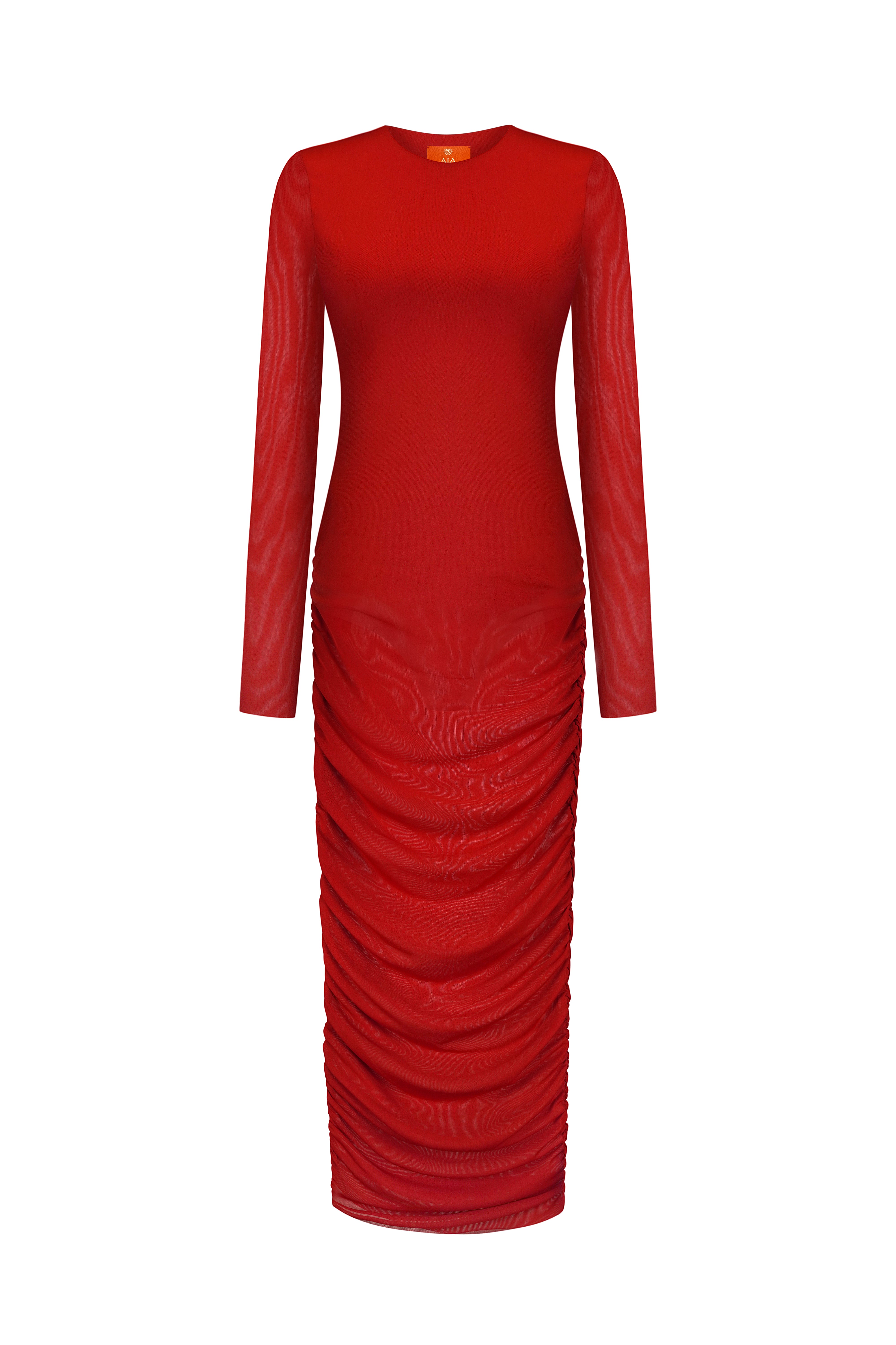 Драпірування вздовж довжини пливе хвилею, огортаючи тіло й створюючи стрункий, витончений силует — мов вода, що ковзає берегом.
